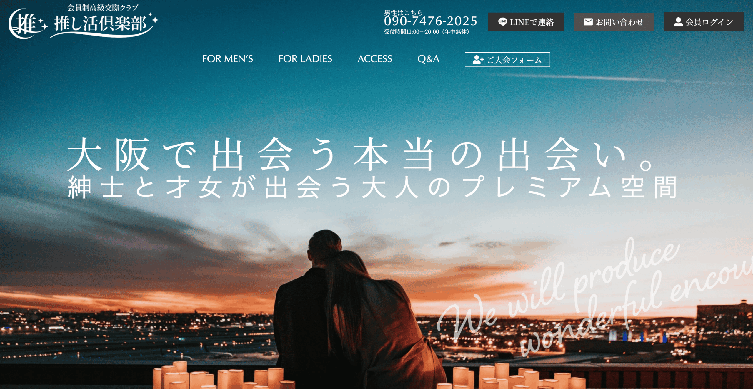 令和の時代に誕生した、新たな出会いの場が【大阪推し活倶楽部】です。パパ活でも交際クラブでもなく新たな形の推し活ジャンルとして若い世代から注目を集めている倶楽部です。恋活や婚活として幅広い男女の出会い方を提供しており、現在会員登録数も増えてきております。マッチングアプリの様にカジュアルに活動でき、尚且つ安心に出会える唯一無二のマッチングサービスです。大阪・京都・神戸・名古屋・福岡・東京とエリアも全国展開も目指している様です。