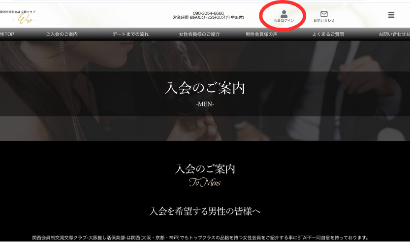 まずは男性用TOP ページの右上にございます、会員ログインのボタンをクリックしてください。